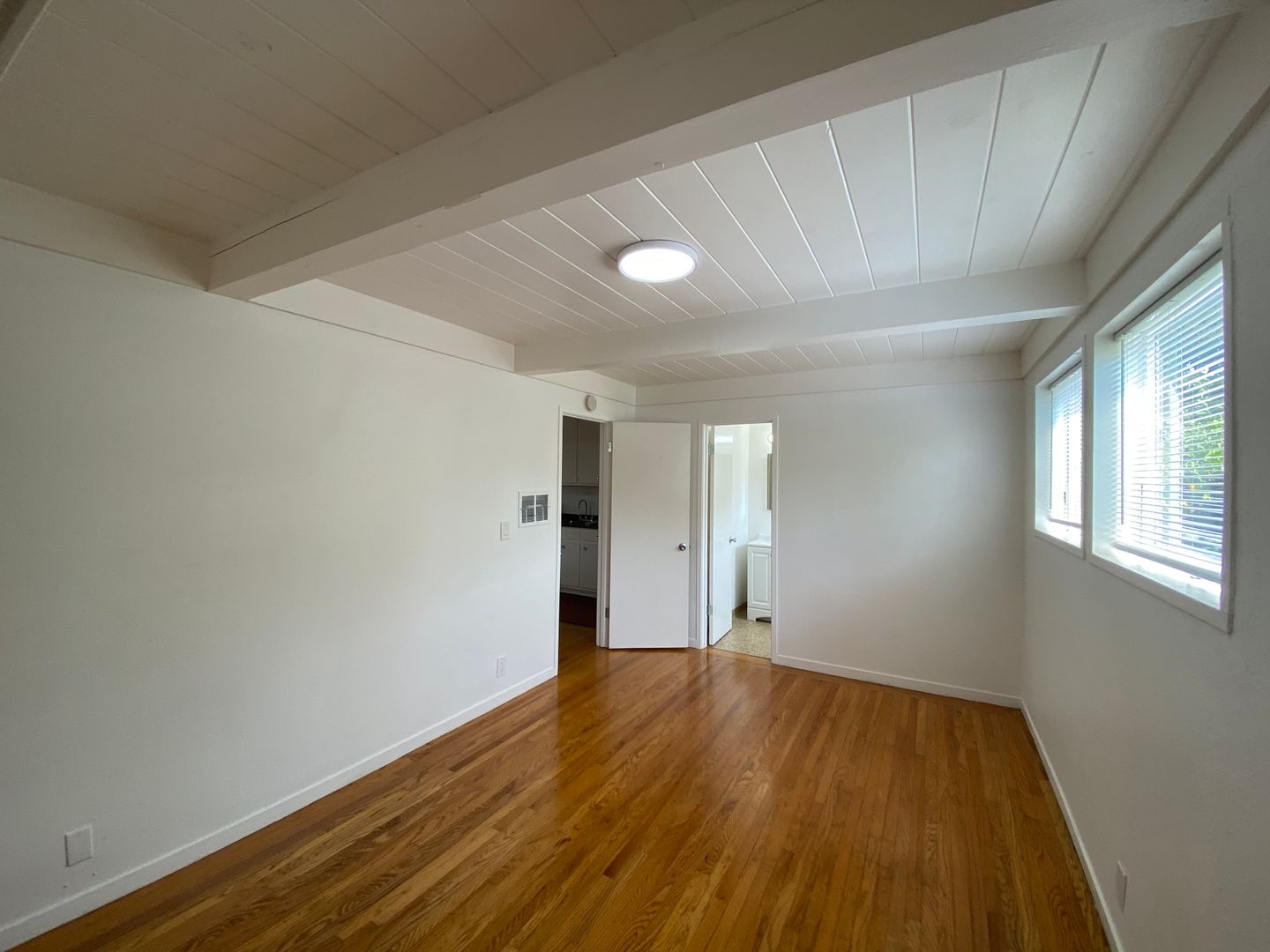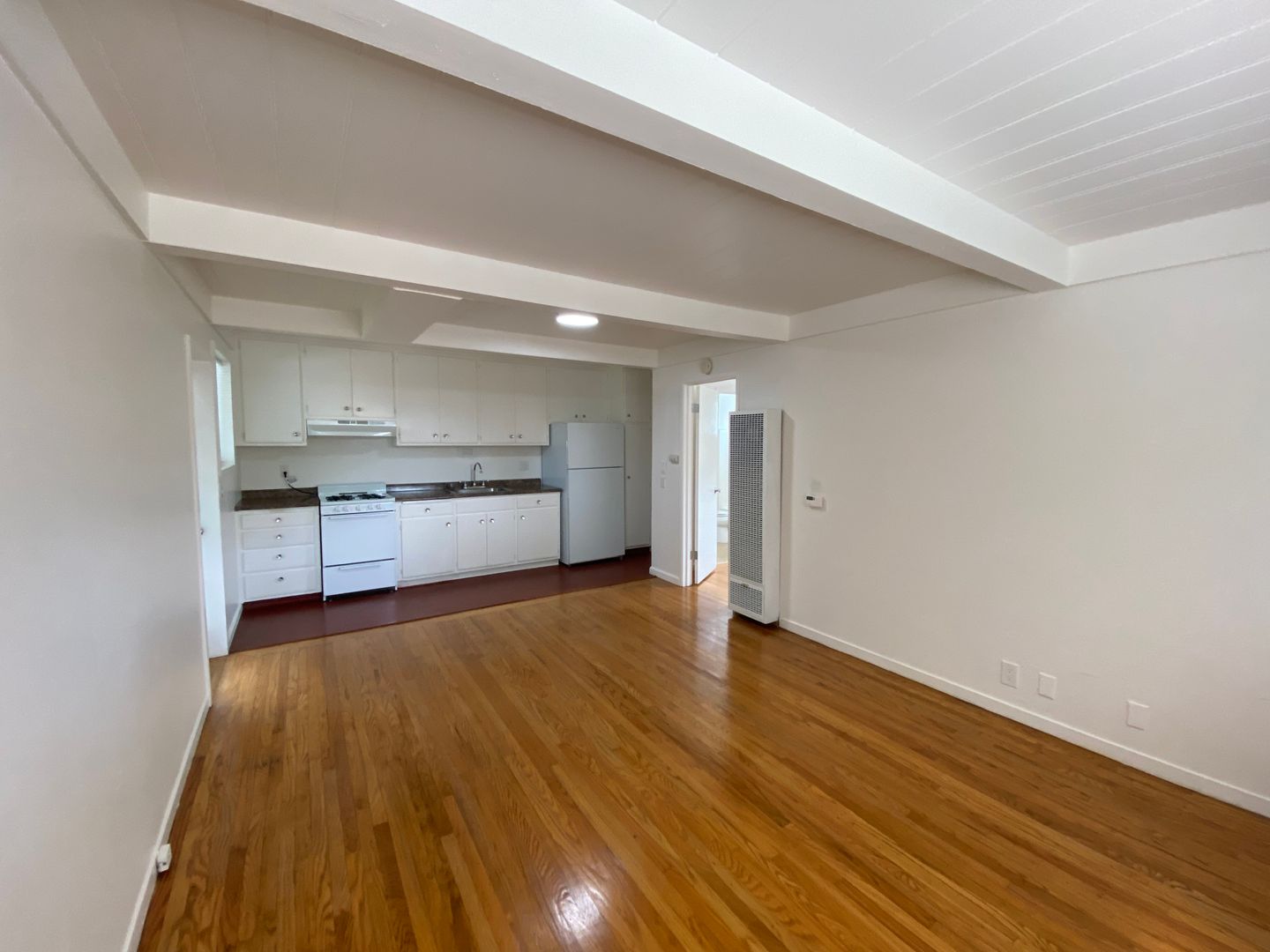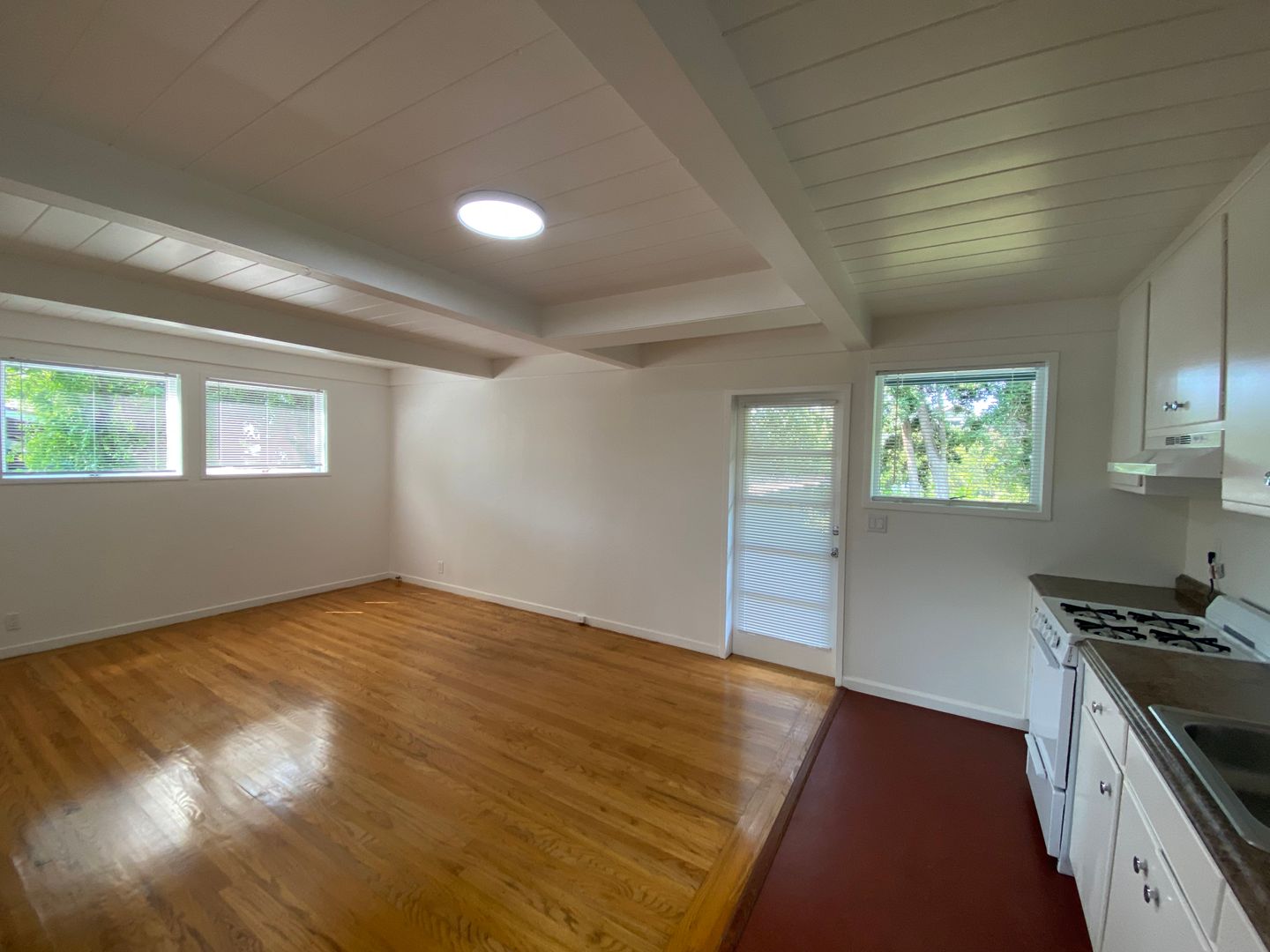 Sunny, tranquil one-bedroom one-bath apartment with hardwood floors and painted and natural wood beamed ceilings throughout. Open floorplan kitchen/dining/living room with verdant outlooks onto the shared sitting garden. The kitchen features solid surface countertops, a gas range, and ample original wood cabinetry. The bathroom is off of the bedroom, with a shower over a full-size bathtub. Good-sized bedroom with a large closet.