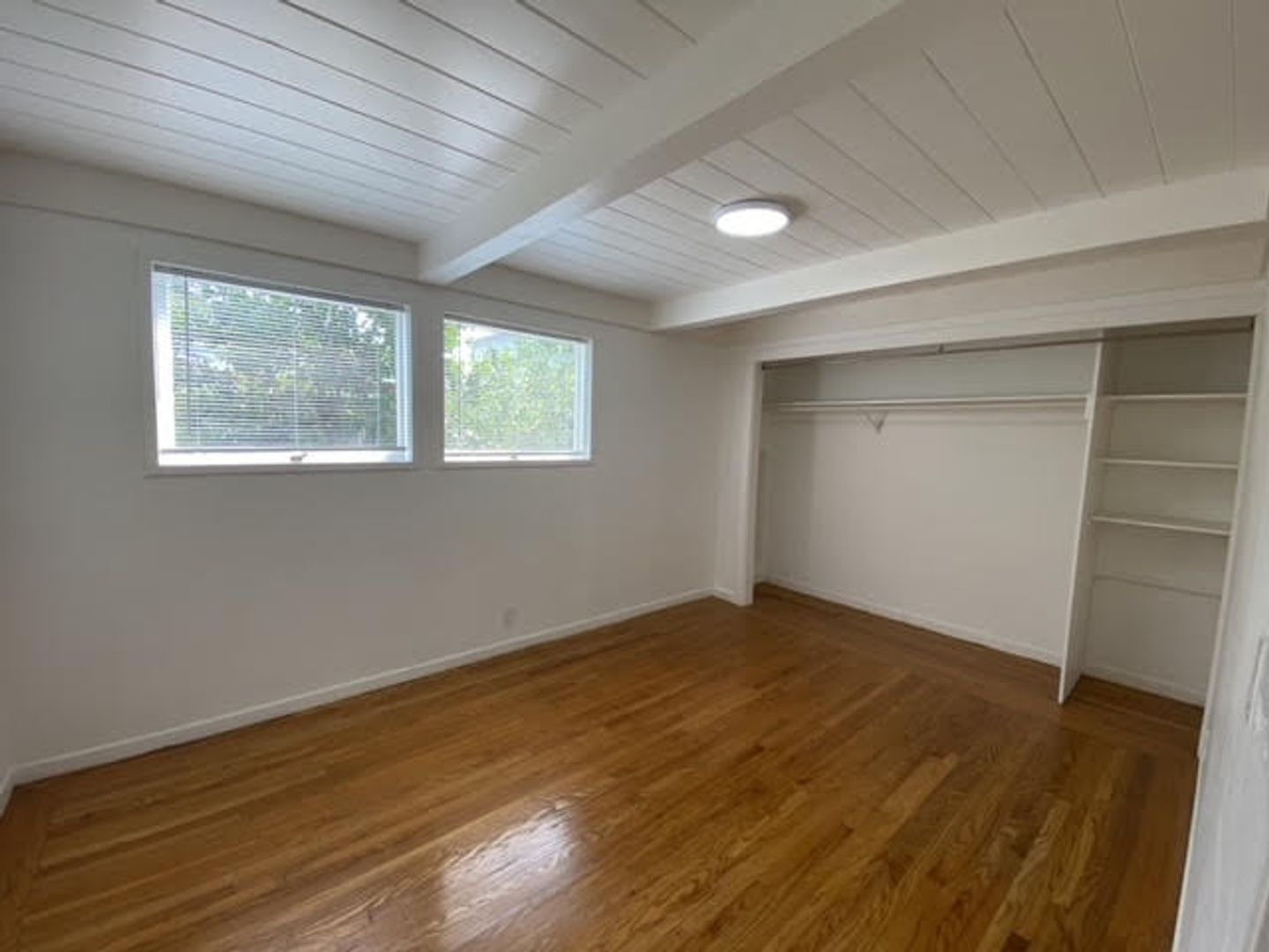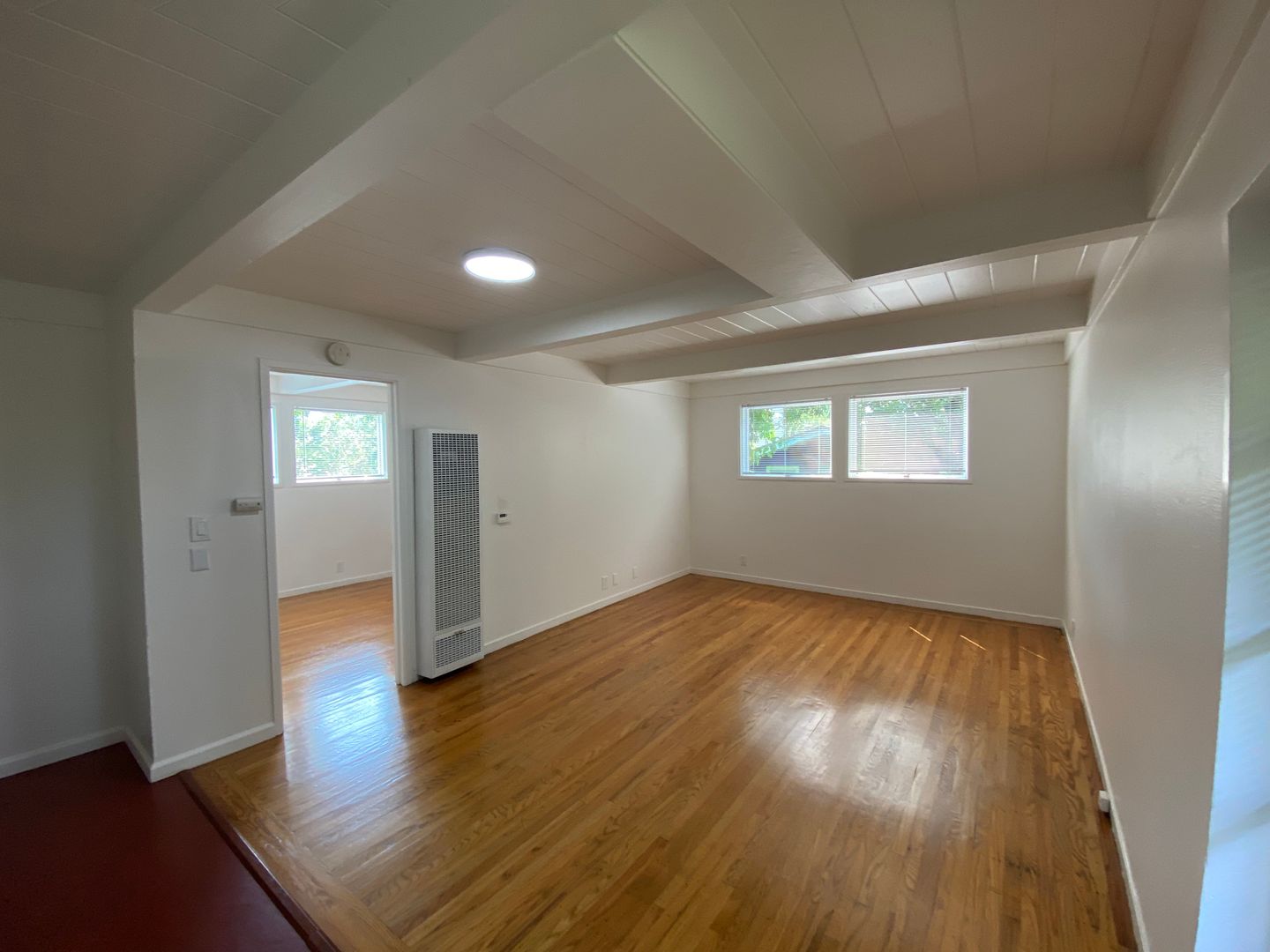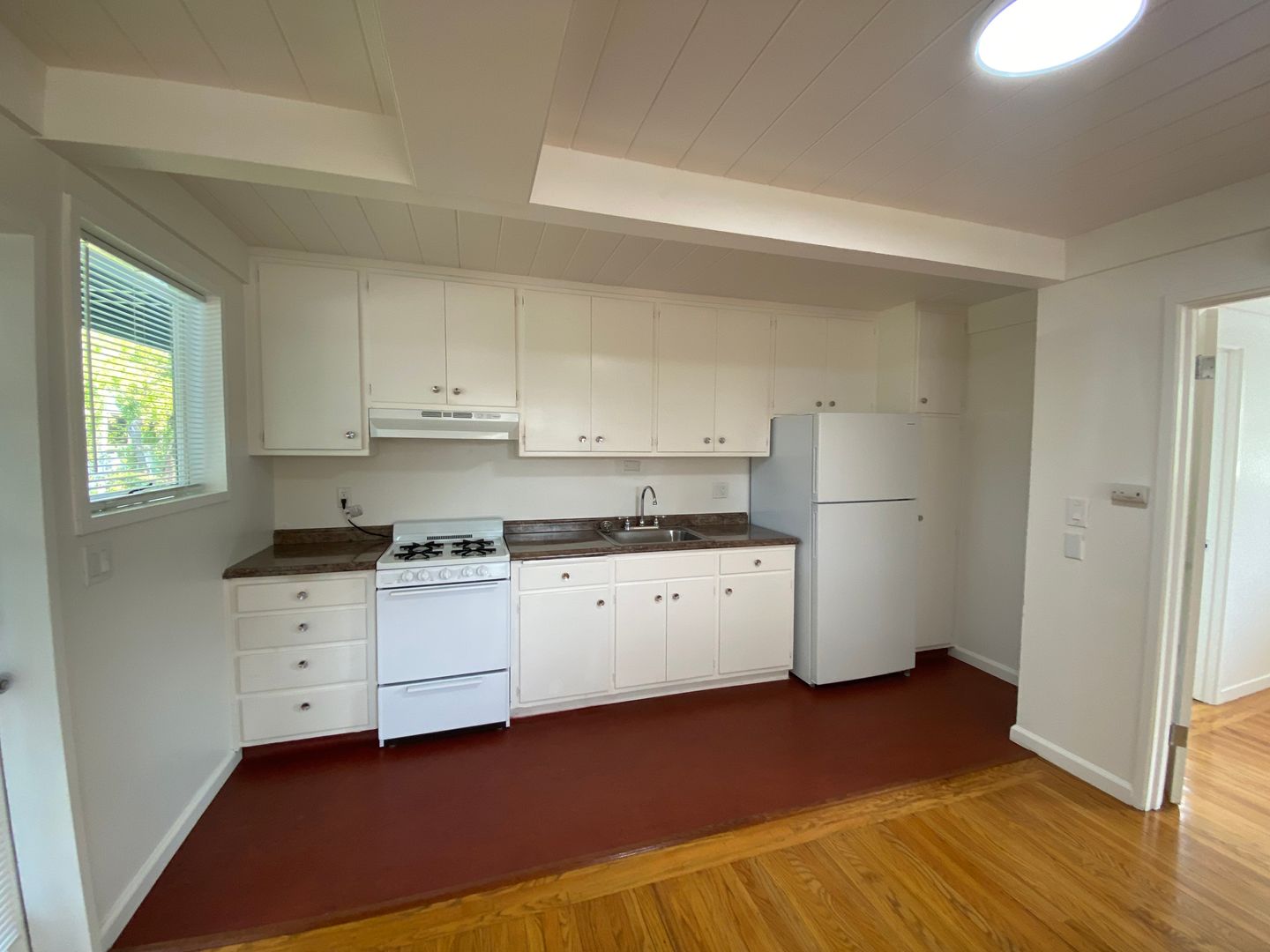 Sunny, tranquil one-bedroom one-bath apartment with hardwood floors and painted and natural wood beamed ceilings throughout. Open floorplan kitchen/dining/living room with verdant outlooks onto the shared sitting garden. The kitchen features solid surface countertops, a gas range, and ample original wood cabinetry. The bathroom is off of the bedroom, with a shower over a full-size bathtub. Good-sized bedroom with a large closet.